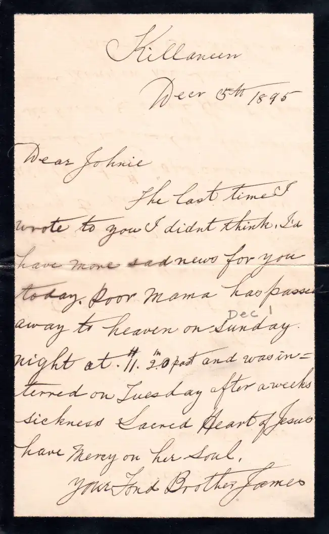Two generations of the Boyle family emigrated from Killaneen beginning with the departure of my Granduncle, Patrick Boyle, who arrived in the U.S. around 1880, aged 22. Patrick’s emigration set a trend and three of his nine siblings, all brothers, would follow him to America. The departure rate would sadly turn to a flood in the following generation, with four of the family emigrating to the U.S. and two to England. In addition seven of their nine Doherty cousins, the children of Patrick Boyle’s oldest sister Mary and her husband John Doherty from Knockmullin in Fenagh, also emigrated to America. With no practical telephone contact in those years letters became a very important connection between emigrants and home and often contained remittances of money from the U.S., and later legacies, to support parents and younger siblings like those left in Killaneen. The oldest letter we have in our collection dates back to 27th December 1893 and is written by Patrick’s Father Thomas Boyle, my Great Grandfather, to his son Jonny (John) in America and in it he thanks Jonny for a Christmas gift of £4. The letters cover a wide range of topics, often providing interesting news from home and, in return, the progress of family members abroad, against the background of such major events as World War 1, the War of Independence, the Depression and World War 2. Some letters from home contained sad news such as those advising the deaths of my Great Grandparents, Thomas and Bridget Boyle, within two months of each other in 1895. Other letters from abroad often contained joyous references to marriages and births.