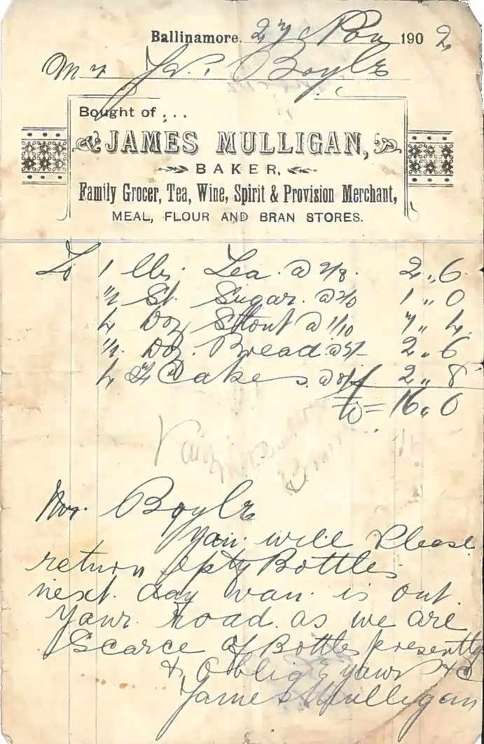Most families are slow to throw out all old documents and instead retain some, often those items considered to be of importance for age or content reasons. We were particularly fortunate in being able to put together, from different sources, a collection of a hundred years of correspondence spanning four generations, chronicling the emigration patterns and the lives of the family’s members. What can we learn from the collection? First and foremost we can see the effectiveness of letter writing as a communication tool in maintaining family bonds over long periods, and across great distance, in the absence of physical contact. Sad to say those family members that went abroad and didn’t maintain communication by correspondence were gradually lost to the family circle, as were their offspring, if any. As mentioned the letters also provide evidence of the regular remittance of money home to Killaneen and also substantial legacies which a Leitrim historian has found of benefit in their recent research into such remittances. In one letter, Patrick, who was the first to emigrate in 1880, tells his Mother all of 15 years later that he and his two brothers, also in America, ‘will keep up our end that is the financial end’. The inference was that it fell to the siblings remaining in Killaneen to maintain the family home and farm and look after their aging parents while the emigrants would assist financially. It would also appear that the emigrants were generally content with their choice to emigrate and grasped the new opportunities available to them abroad. Any indication of a desire to return home was only referred to on a visit basis. We also see that in Chicago, where the Boyles mostly settled, they were in touch with cousins and neighbours from back home who had also emigrated. That way they were able to maintain contact with many fellow Leitrim emigrants including their Murphy cousins from Gorvagh, O’Rourke cousins from Crimlin near Aughnasheelin, Muldoons from Cloodruman, Fenagh and of course their Doherty cousins from Knockmullin in Fenagh. Family bonds and Leitrim community bonds were of great importance to them, as was the news from home which they regularly asked for in their letters home. On account of the emigrants’ desire for news from home we learn a certain amount of what was happening in the Killaneen area in the late 1800’s and early 1900’s, e.g. deaths and marriages and the movement of people from a farming background, like the Martins and Flynns, from the land into the town of Ballinamore to set up in business.