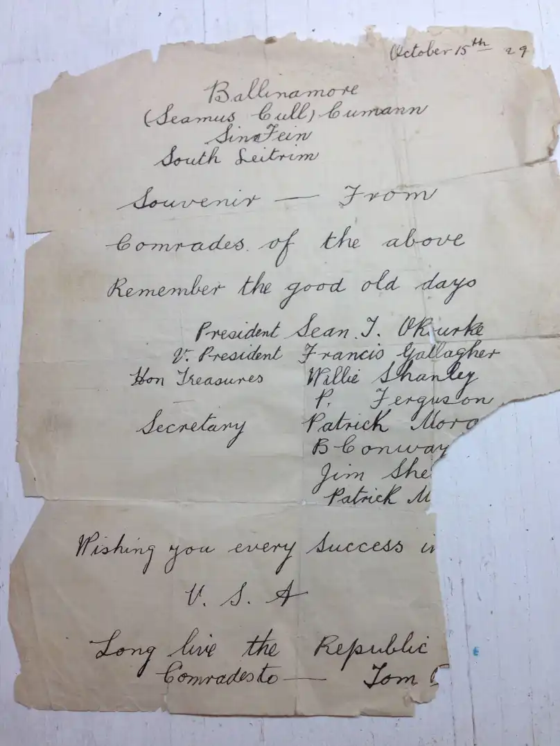 The Lockdown periods from March 2020 onwards provided many people with the opportunity to pursue time consuming indoor projects, if they were fortunate to have any. I was lucky when my cousin Tom Boyle contacted me in early 2021 with a plan to commit about 100 years of family letters into book form to share across the extended family, in Ireland and abroad. The compilation, spanning the years 1893-1994, contains letters, postcards and telegrams that were written by, or to, four generations of our family. There are also a small number of other related documents. Tom lives in Boston, his Grandfather Joe Boyle, my Granduncle, left Leitrim for the U.S. in 1900, aged 18, returning on at least one occasion that we are aware of. The Boyles lived in Killaneen, about 3 kilometres south west of Ballinamore on a farm of about 22 acres, they have also been recorded over the generations as being skilled stone masons and carpenters. We can trace a Boyle family connection to the area back to at least the mid to late 1700’s via the original Boyle headstone erected by one Daniel Boyle to his parents within the walls of the local Fenagh Abbey. Tom and I have collaborated for 10 years on researching our family’s history. He is the ‘computer guy’ who is also gifted at on-line research and he has created a comprehensive digital record of our family history as well as that of his Italian-American Mother’s family, the Zallios. My role is more about providing and explaining the Irish context to much of our findings as well as going about procuring actual items, documents, photos etc. relating to the Boyles.